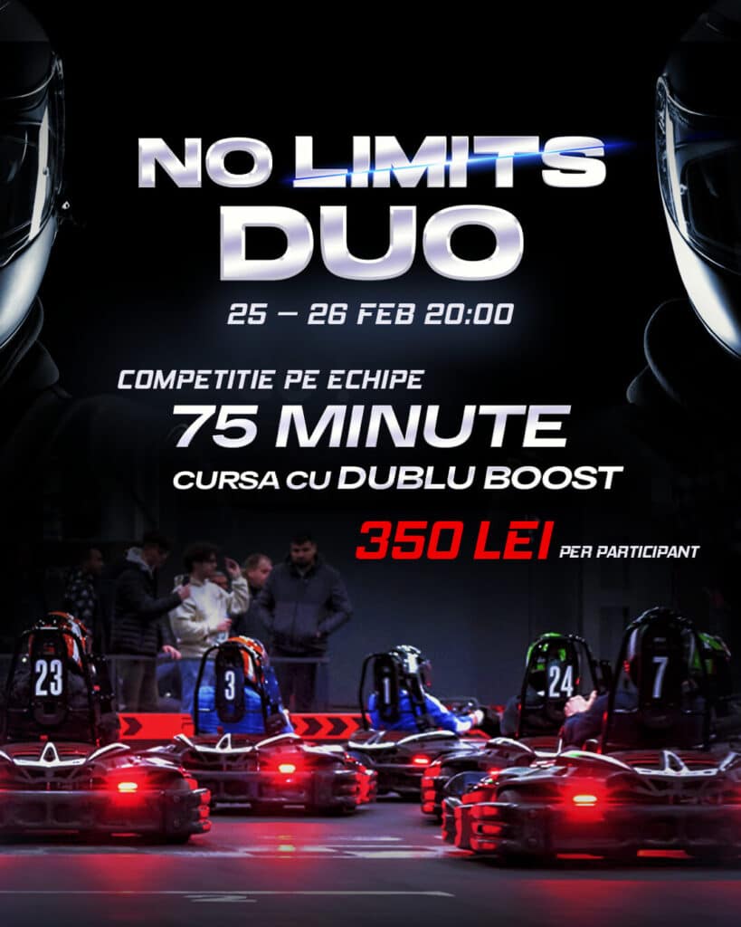 Vmax Karting te invită la No Limits DUO, o competiție de karting de anduranță, unde doar cele mai rapide și determinate echipe vor avea șansa să urce pe podium. Cursa spre victorie începe pe 25 – 26 februarie, ora 19:30